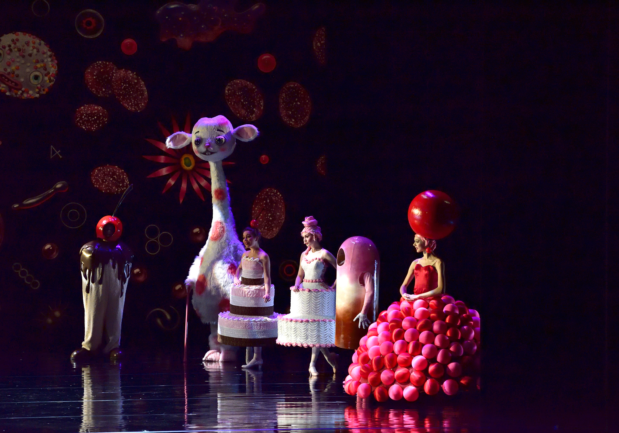 Rachel: While both productions use approximately 30 supernumerary characters, each uses them in a different way. In ABT’s Nutcracker, the supers are almost all children who dance in the opening scene; in Whipped Cream, the 30-plus supernumerary characters face the complexity of maneuvering in their intricate and challenging costumes. The supers are primarily fictional creatures used to give a deeper look into the kingdom of Princess Praline. These incredibly detailed costumes include a snow yak which requires two people to maneuver with two additional supers to assist, a smaller pink yak, cupcakes, a chocolate chip man and a long neck piggy. There are two supernumerary roles that portray humans, but each wears a very large fake head; one even wears platform shoes to make him over 7 feet tall. When we go on tour, we hire local supers to fill these roles, and they are always surprised by the intensity of their costumes in their first stage rehearsal. It usually takes the four people inside the snow yak several tries before they can successfully move it about the stage.